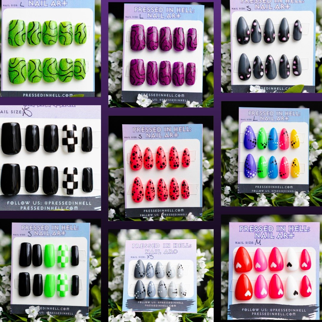 Pressed in Hell press-ons are made to be reused, so the set you fall in love with can come back out for the next occasion, and the one after that.
